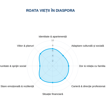 Te ajută să vezi, într-o formă simplă și vizuală, cum stai în acest moment în ariile esențiale ale vieții tale în diaspora: adaptare, siguranță, carieră, relații, identitate, echilibru emoțional și sens personal.