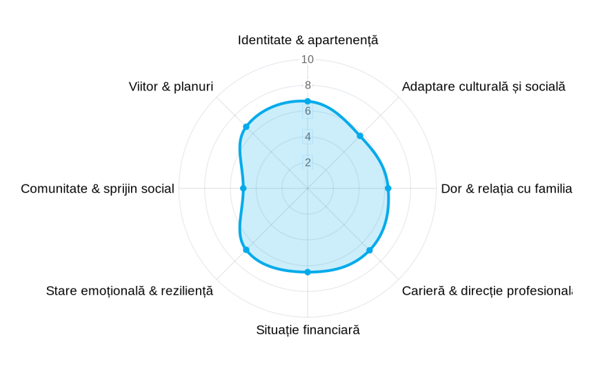 Te ajută să vezi, într-o formă simplă și vizuală, cum stai în acest moment în ariile esențiale ale vieții tale în diaspora: adaptare, siguranță, carieră, relații, identitate, echilibru emoțional și sens personal.